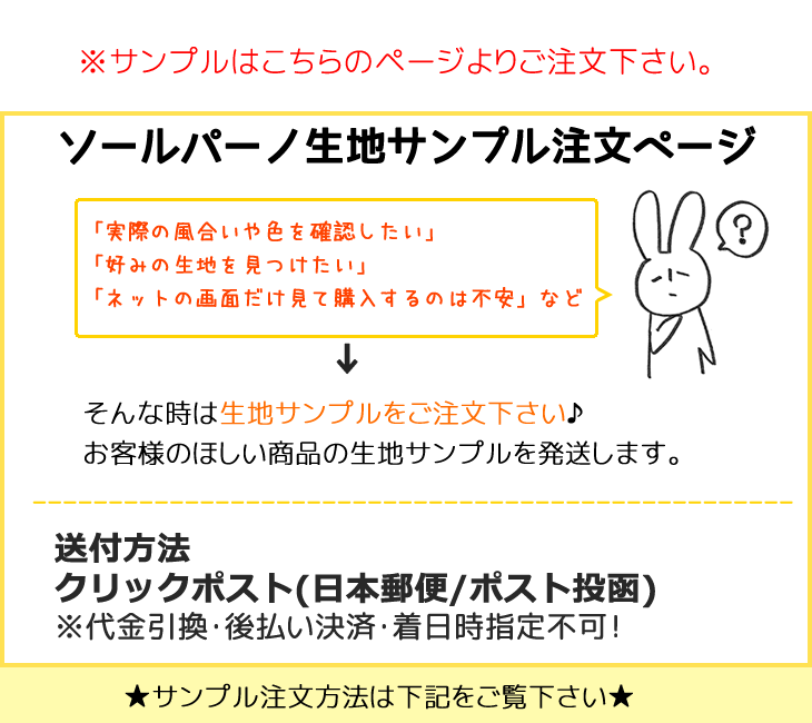 【有料サンプルはコチラをクリックください】 「風合いや色を事前に確認したい」「ネット注文は実物を見ていないから不安…」 ソールパーノではサンプル送付サービスを行っております。